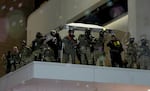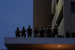 About a dozen Department of Homeland Security and other federal officers watched from the roof, keeping dry from the rain under a pop-up canopy tent.