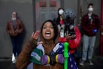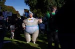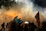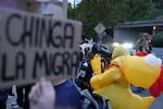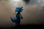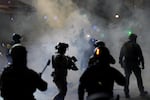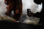 Around 7:30 p.m., the federal agents on the roof unleashed a barrage of tear gas, pepper balls and flash-bangs into the crowd below after officers on the ground had cleared a driveway for vehicles. The gas was thick enough that the ICE building was no longer visible from the street. People inside their inflatable costumes could be seen choking on the fumes.