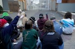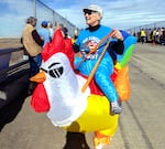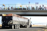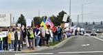 High above Interstate 84 in Pendleton, about 200 protesters filled a highway overpass. Cars passing below honked occasionally as they passed a demonstrator in an inflatable chicken suit and hanging banners that read “No Monarchy” and “Save Democracy.”
