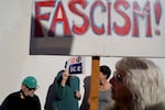 About 3,500 people gathered at the federal courthouse in Eugene. Among the marchers was 66-year-old Bonnie Pettit. She held a sign with a photo of her father in uniform, which read “My father fought fascism in World War II. Now I will.”