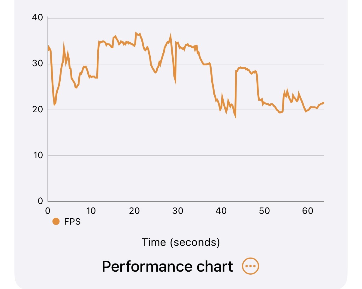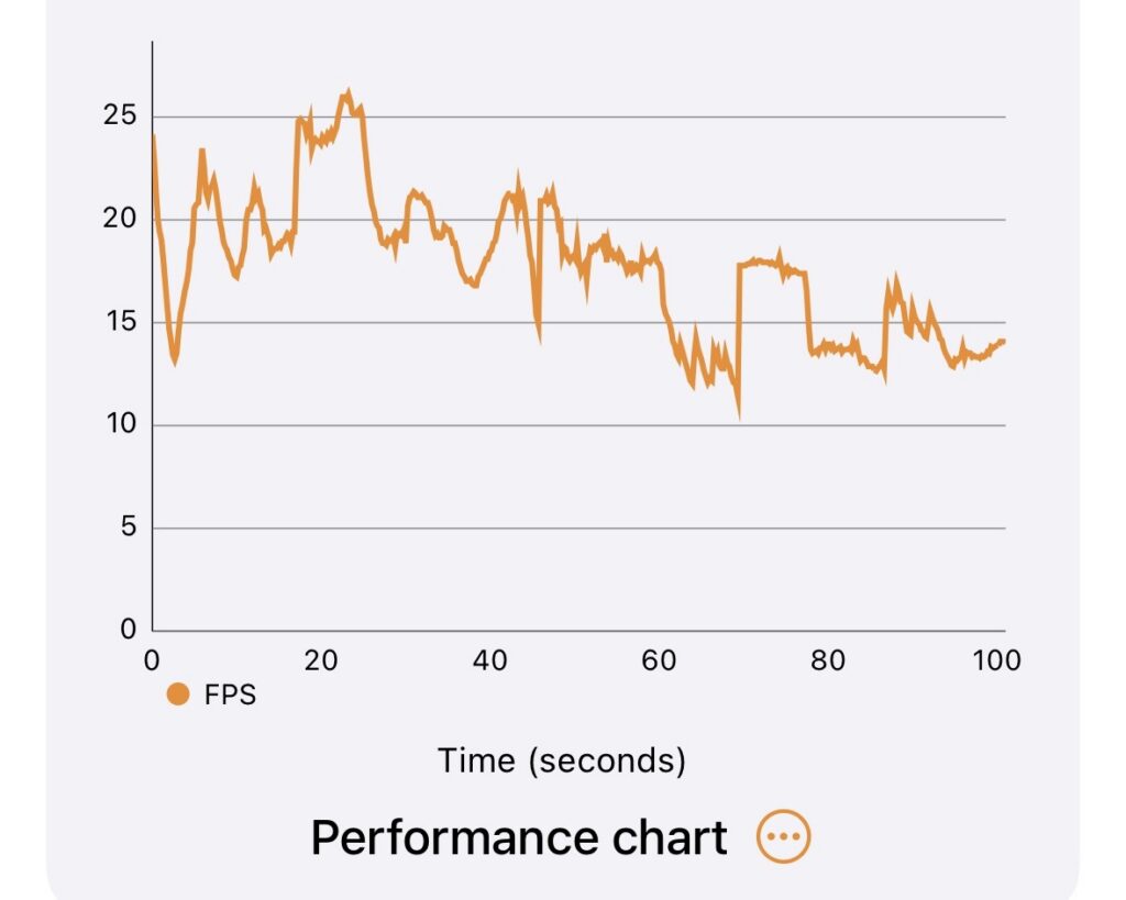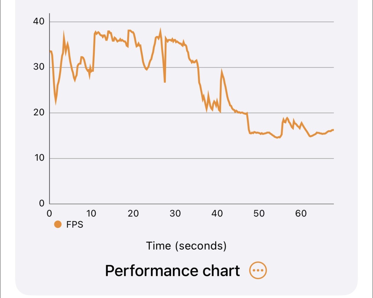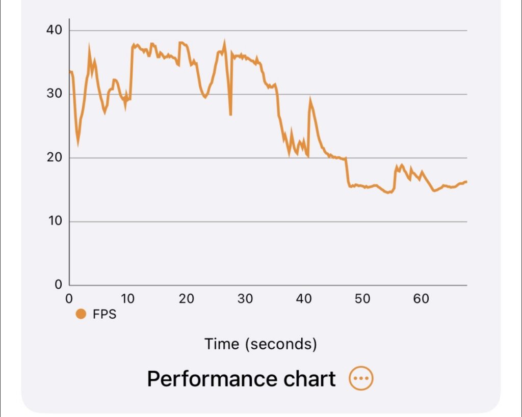 And the iPhone Air’s 3DMark Wildlife Extreme Unlimited chart. Note that for the others, the numbers changed but the shape of the line did not. The more aggressive thermal throttling here affects performance disproportionately toward the end of the run. The iPhone 17 Pro doesn’t have this problem.