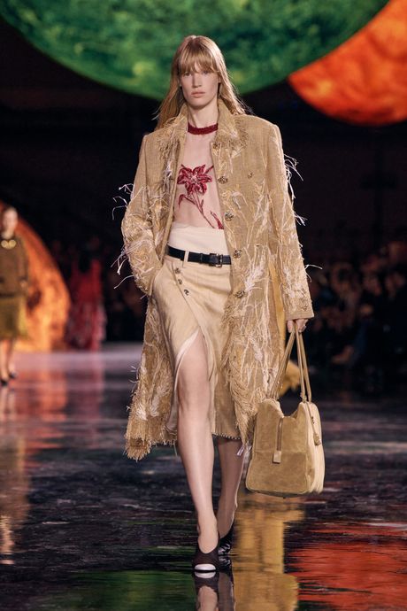 That led Blazy to create an evening look with a slim, below-the-knee skirt in rusty-brown tweed with a thickly fringed hem and an earth-red shell top embroidered with black and bone-white quills; a semi-sheer suit in a subtly blown-up plaid of red, orange, and yellow; and Odhiang’s flowing ball skirt embroidered with jazzy, spiky flowers and worn with a plain off-white silk T-shirt. Blazy said the flowers were a Flemish touch. In the studio, though, they refer to the skirt as “piña colada.”