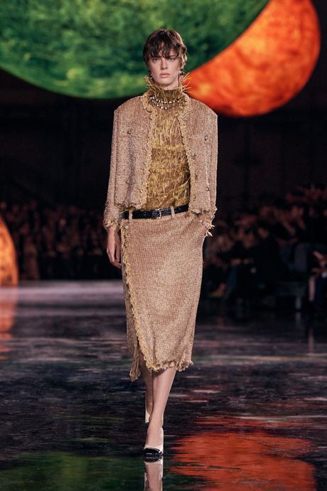For Blazy, it has been quite a journey and, more pertinently, a journey of discovery into the world of Gabrielle Chanel, which began early in the 20th century. To me, the show — on a set with a specially poured floor in streaky deep blue and a dozen glowing planets suspended above our heads — it felt as though we were space-time travelers, seeing things about Chanel that were new but also set in a much larger context.