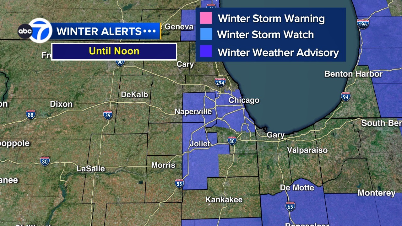 A Winter Weather Advisory is in effect for Cook, DuPage and Will counties until noon on Monday.