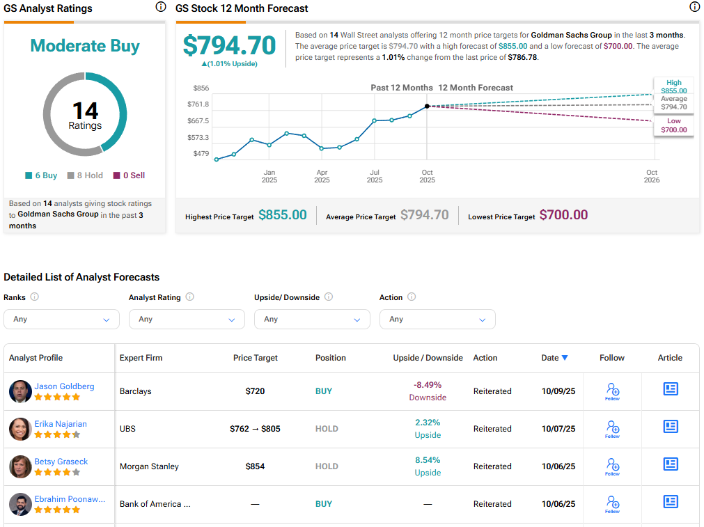 Overall, Wall Street has a Moderate Buy consensus rating on Goldman Sachs stock based on six Buys and eight Holds. The average GS stock price target of $794.70 indicates a 1% upside potential from current levels.