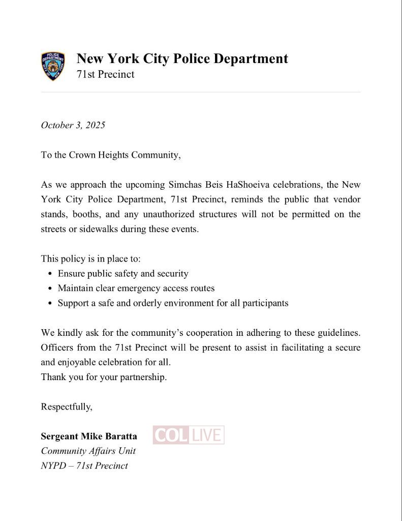 As Crown Heights prepares for the lively nights of Simchas Beis HaShoeiva, Sergeant Mike Baratta of the NYPD 71st Precinct Community Affairs Unit has issued a letter reiterating that no stands, booths, or unauthorized setups will be permitted on the streets or sidewalks during the celebrations.