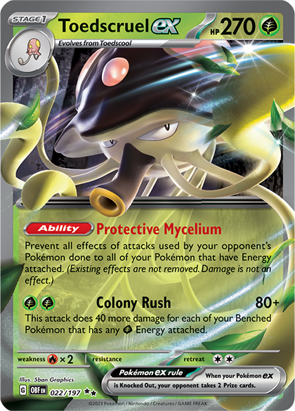 I’ve added some other useful Grass-type Pokémon, Toedscruel and Toedscruel ex. Toedscruel’s Slime Mold Colony Ability stops your opponent from using Trainer cards or Abilities to bring cards from the discard pile to their hand. This is especially good against decks like Gholdengo ex and Raging Bolt ex that use Superior Energy Retrieval or Night Stretcher. Toedscruel ex’s Protective Mycelium Ability prevents all effects from your opponent’s attacks (not including damage) done to your Pokémon with Energy attached. These Toedscruel really give this deck a few extra pitches to strike out your opponent’s strategies, and they can even stop cards like Dragapult ex from placing damage counters on your Pokémon via its Phantom Dive attack.