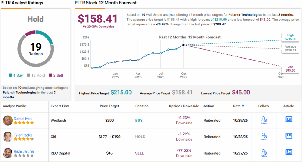 Wall Street’s broader stance isn’t exactly enthusiastic, either. The Street leans cautious, with 13 Holds and 2 Sells overshadowing 4 Buys, giving PLTR a Hold (i.e., Neutral) consensus rating. Moreover, the average 12-month price target sits at $158.41, suggesting the stock could pull back by ~21% from current levels. (See PLTR stock forecast)