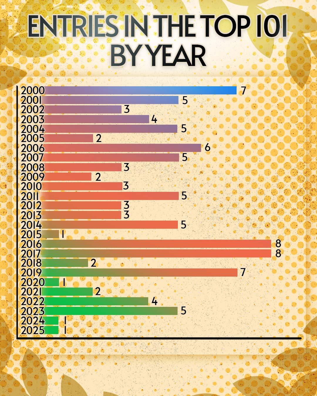 2016 and 2017 led the way with eight entries apiece, while 2019 had seven. (We’re never gonna have a movie year like that one again, huh?) 2022 and 2023 also claimed four and five spots, respectively, which is in line with the best of the 2001-05 period. Even 2025 has a performance here—and that’s before the awards-season favorites begin to roll out in the next few weeks. (Again, not that those awards are gonna influence us or anything.)