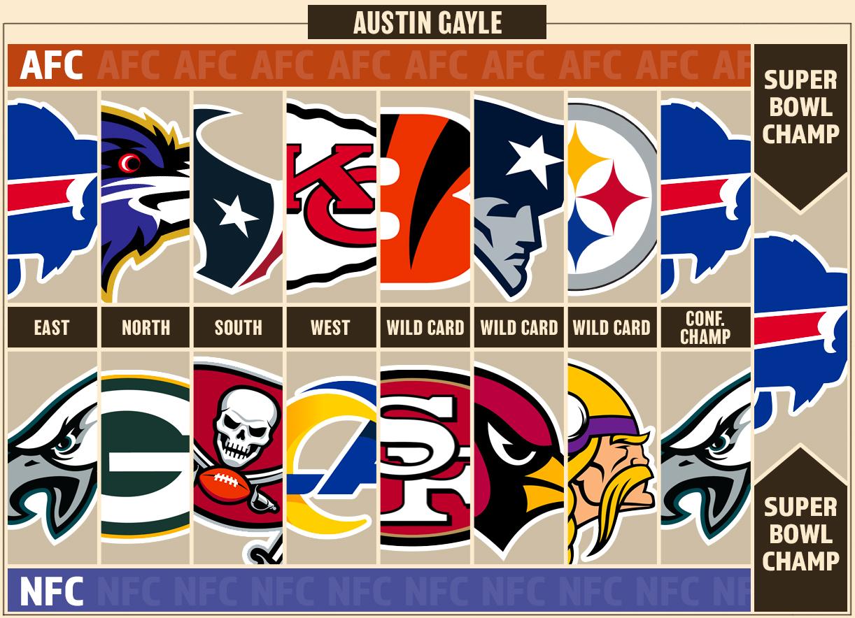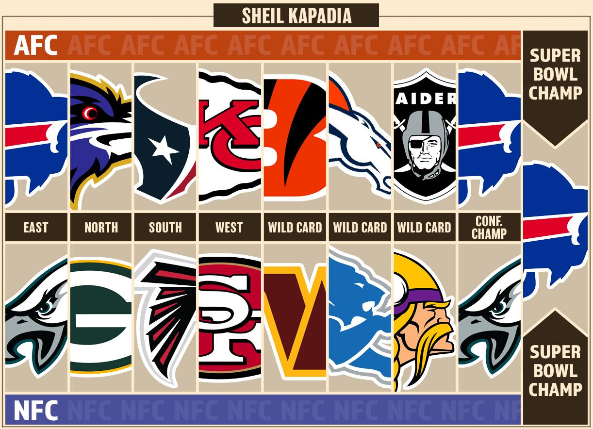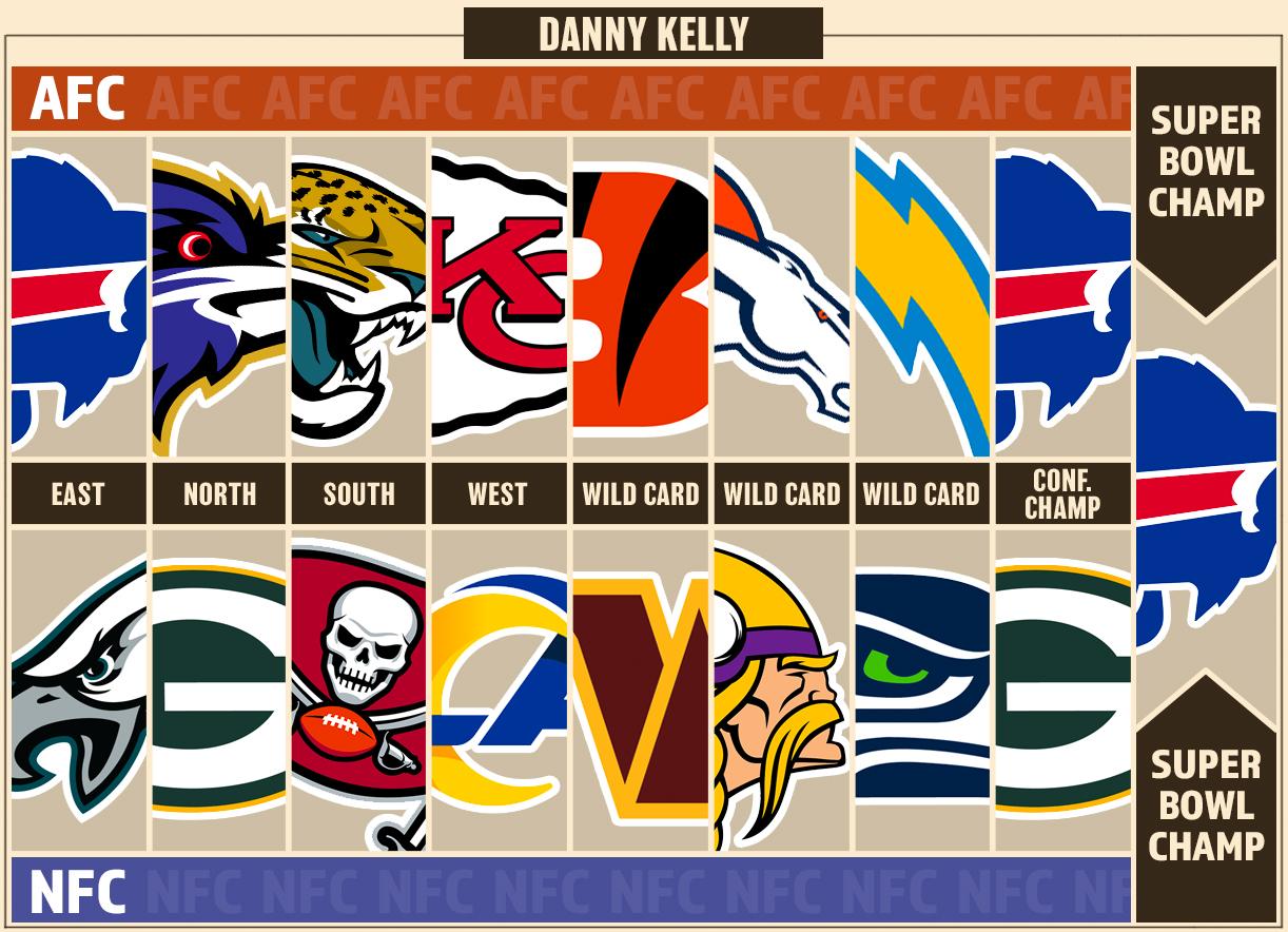 Sheil Kapadia: If I pick the Bills every year, I have to be correct at least once, right? RIGHT?!?! Josh Allen is at the peak of his powers and has a good offensive line and a well-rounded supporting cast. Buffalo’s projected schedule looks easier than those of its AFC counterparts, so I’m counting on the Bills to grab the 1-seed and host the divisional round and the AFC championship. Do I trust the defense in a big spot against Patrick Mahomes? Of course not! But let’s keep our fingers crossed and hope for the best.