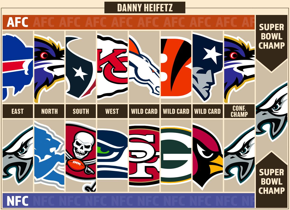 Danny Heifetz: It’s super boring to pick a repeat champion. I don’t care. I saw what I saw. The Eagles are clearly the best team in the NFC. Picking a non-Eagles team to make the Super Bowl gives me hives. As long as Philly can push its QB in the butt for a yard gain whenever it wants, I’ll pick the Eagles to win the Super Bowl.
