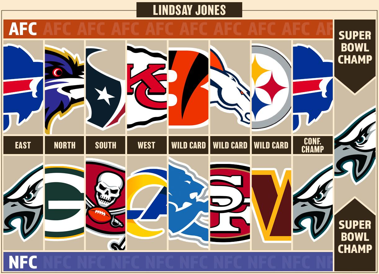Lindsay Jones: Yes, a boring chalk pick here. But this roster is (still) stacked, and they’ve got so many different ways they can win—through Saquon Barkley and the run game, with deep balls to A.J. Brown and DeVonta Smith, with Jalen Hurts in short yardage, or on the back of their suffocating defense. It feels inevitable that they’ll face one of the AFC’s Big Three in the Super Bowl, but Philadelphia is built for those big stages.