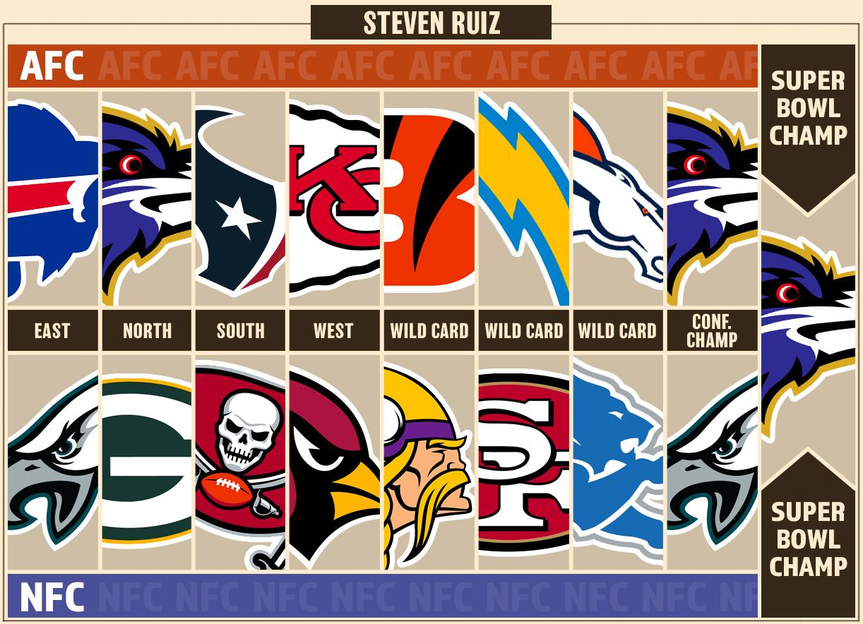 Steven Ruiz: I know I will regret this pick when the Ravens are down by 14 points against Kansas City in the AFC championship game, but Baltimore is going to break through one of these seasons, and this feels like the one. The offense just keeps getting better with Lamar Jackson and Todd Monken collaborating. The defense took off in the second half of last season under first-year coordinator Zach Orr, and I’m not expecting the same early-season sloppiness that cost Baltimore home-field advantage in the postseason. A better regular-season record will lead to better postseason results this time around. As for my pick in the NFC, the Eagles have the best roster in the NFL. That will be enough to get them to the Super Bowl, where they’ll face the team with the league’s best quarterback.