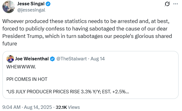 In contrast with the Consumer Price Index, which tracks the cost of final goods, PPI tracks costs through every step of the supply chain, including raw material inputs and intermediary manufacturing. PPI and CPI are closely related measures, of course, and ordinarily they track closely together. But the fact that PPI is spiking ahead of CPI right now suggests that economists’ warnings about the costs of tariffs were right. What we’re seeing is tariff-induced upward price pressure on every step in America’s globally integrated supply chains, all while businesses use every trick in the book to delay passing those costs on to consumers. But delay is all they can do; soon, consumers will be feeling the burn too.
