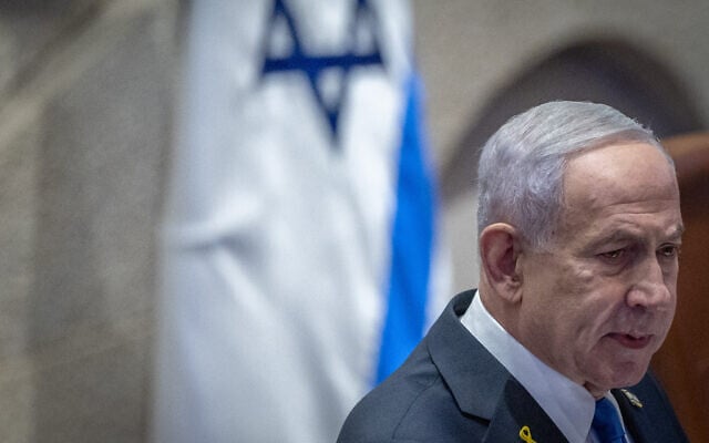 Prime Minister Benjamin Netanyahu speaks during a plenary session of the opening day of the winter session at the Knesset, in Jerusalem, on October 20, 2025. (Chaim Goldberg/Flash90)
