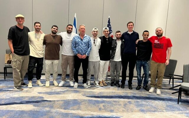 Released hostages with US special envoy Steve Witkoff and White House adviser Jared Kushner on October 21, 2025 in Tel Aviv (Hostage and Missing Families Forum)
