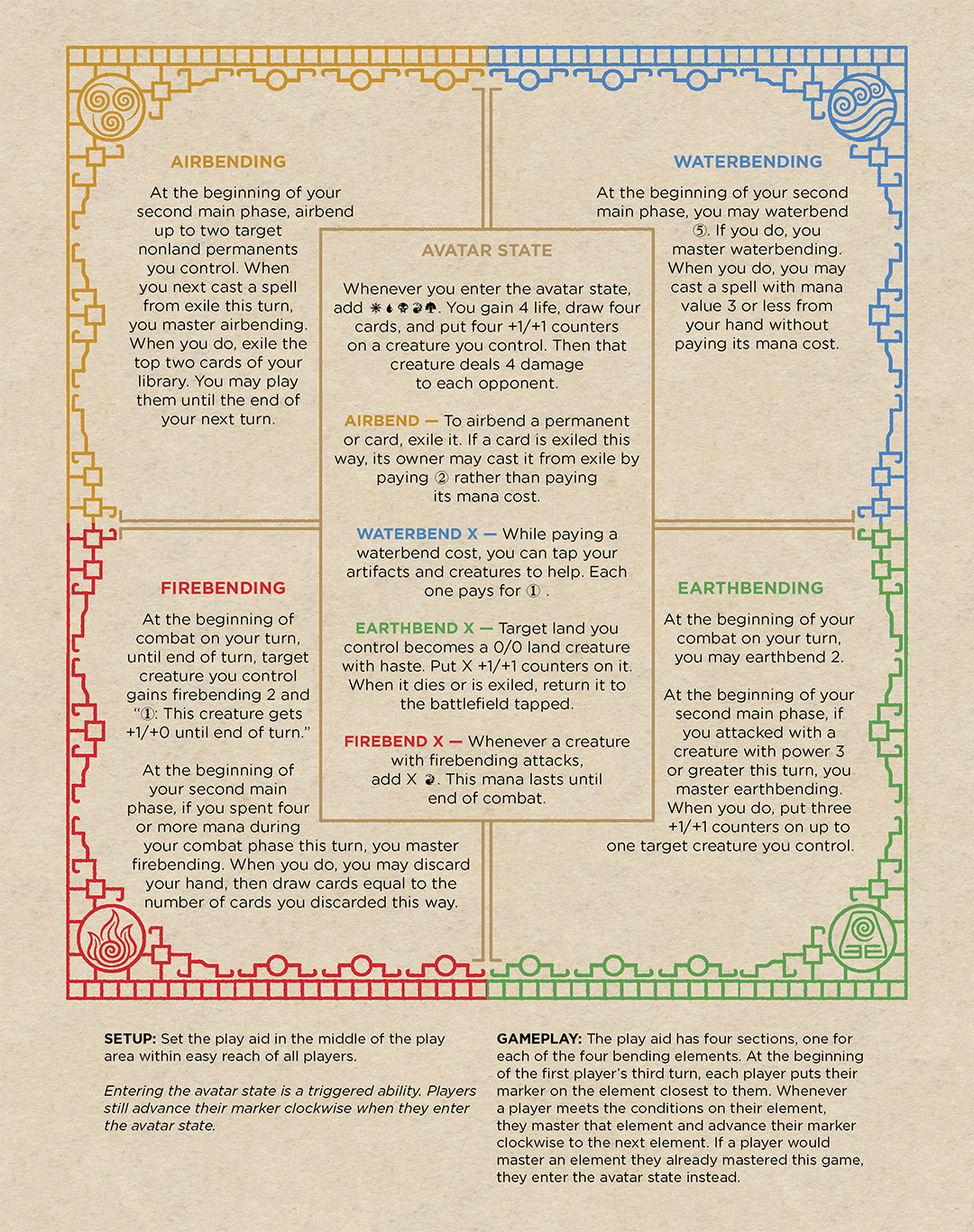 These aren’t just any games of Commander. You’ll be battling your foes while trying to master all four elements. Start by mastering the element closest to you by fulfilling its requirements. Then, you can master the element to your left, proceeding clockwise until you’ve mastered all four elements. By claiming the power of water, earth, fire, and air, you’ll enter the Avatar state and get a massive bonus that’s worthy of your elemental mastery.
